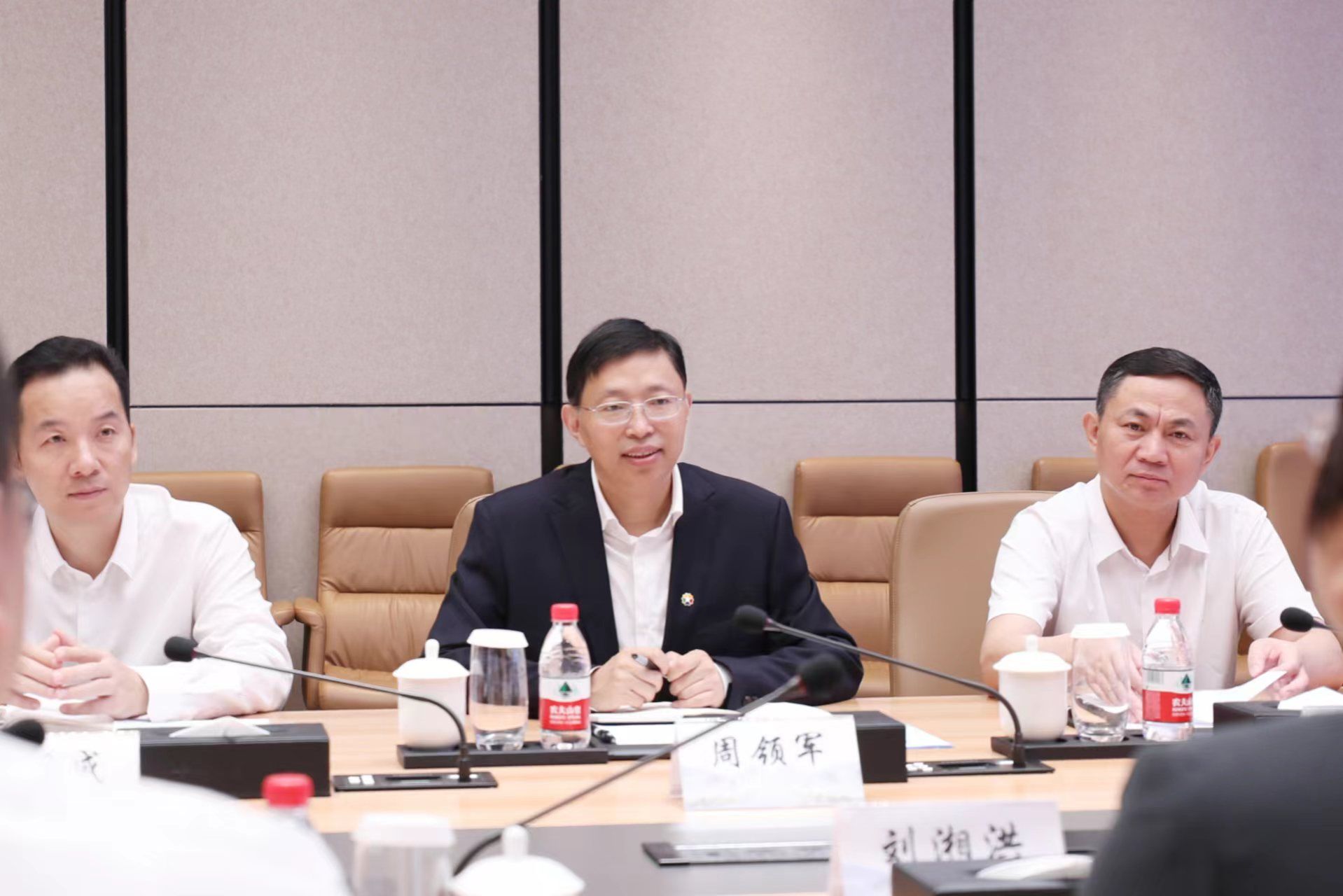 在座谈会上,海口国际免税城党委书记、执行董事周领军热烈欢迎校方到访。
