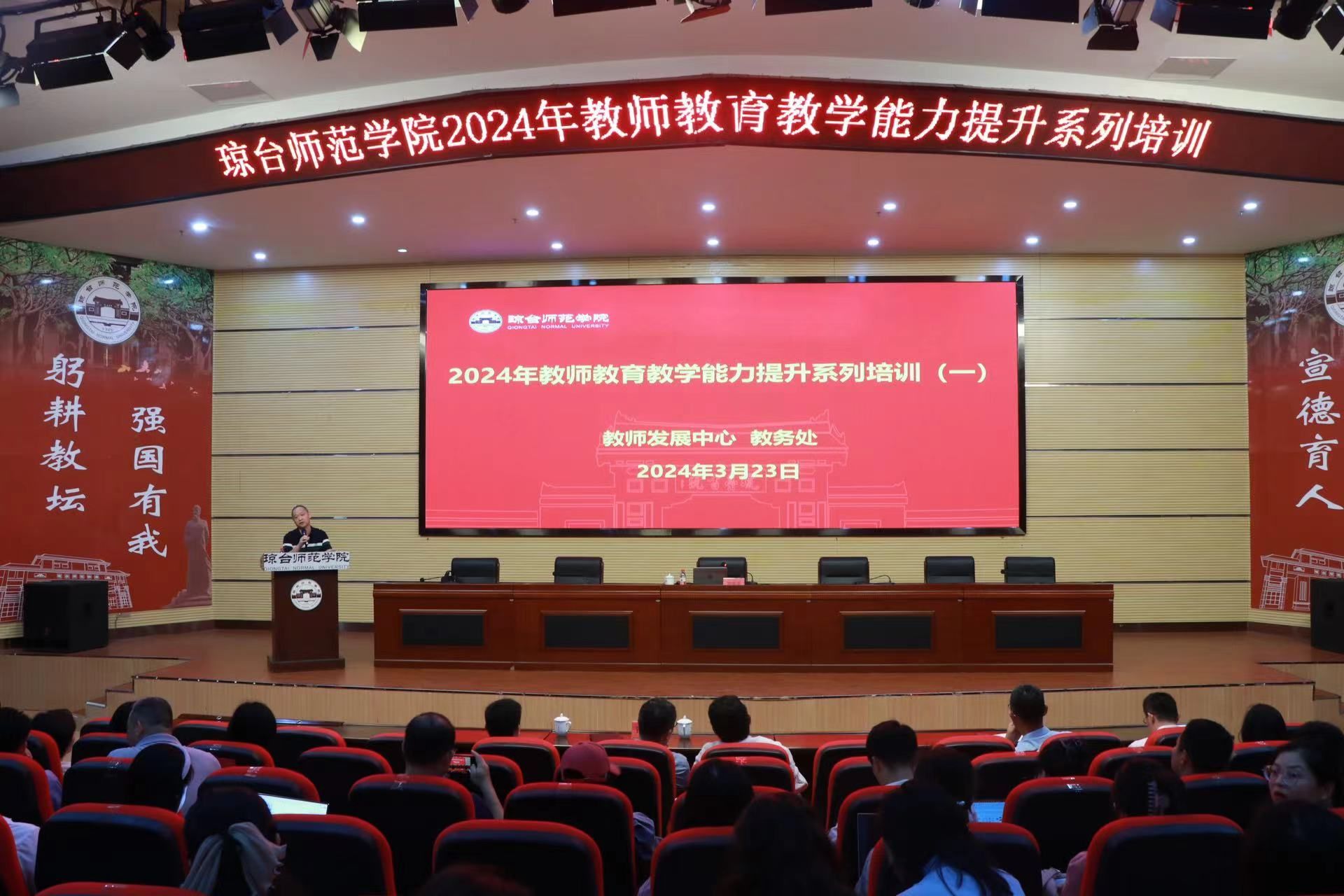 为深入贯彻落实中共中央 国务院《关于全面深化新时代教师队伍建设改革的意见》相关精神,提升我校教师教育教学能力,建设高水平专业化创新型教师队伍,提高教师专业素养和教学水平,鼓励教师强师德、铸师魂、重教育、育人才,推进学校人才培养质量全面提升,3月23日,教师发展中心、教务处联合举办了2024年教师教育教学能力提升系列培训(第一场)。党委委员、副校长银海强,教师发展中心,教务处领导及部门全体管理干部、各二级学院系正副主任、专业带头人、2024年全国教师教学创新大赛海南赛区参赛教师、2022-2023年新进教师及辅导员、2024年兼课教师共200余人参加了培训。本次培训邀请了湖南师范大学教师发展中心主任、教师教育学院副院长罗繁荣,湖南师范大学生物科学学院张纯教授和湖南师范大学公共管理学院彭婷副教授,给参训教师做了内容丰富的讲座及精彩的示范课展示。