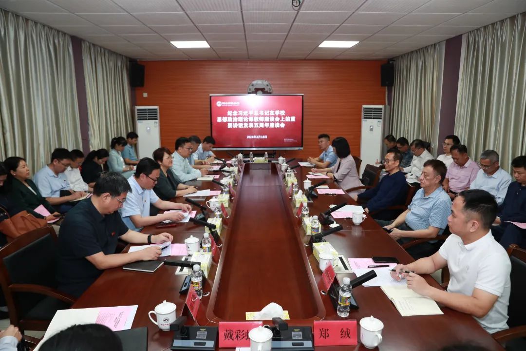 为进一步贯彻落实习近平总书记关于加强思政课建设的重要讲话精神,3月18日上午,我校在府城校区举行习近平总书记在学校思想政治理论课教师座谈会发表重要讲话五周年座谈会,会议围绕“善用‘大思政课’,落实立德树人根本任务”主题,对推进学校思政课改革创新和大思政课建设、助推马克思主义学院内涵式建设和高质量发展进行深入研讨。我校校长刘湘洪,副校长王华、副校长林琛、副校长银海强、副校长王安兴,党委委员、组织部部长陈拥军出席会议。会议由林琛主持。