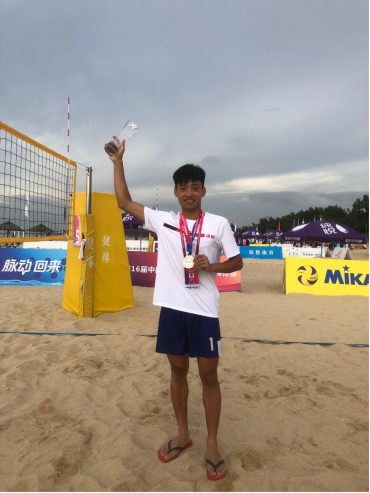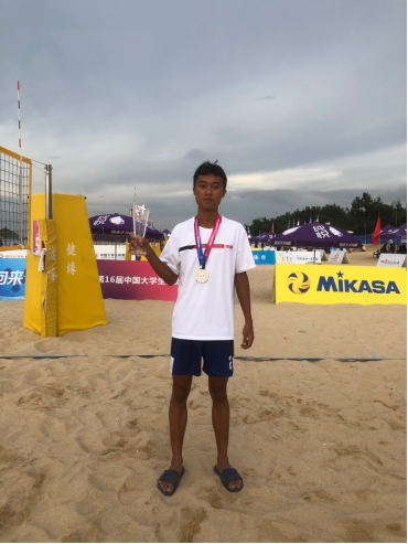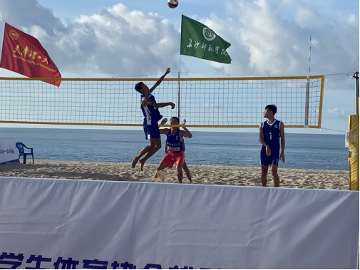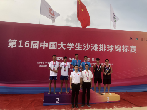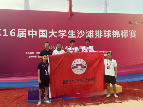 由中国大学生体育协会、昌江县黎族自治县人民政府联合主办,海南省旅游和文化广电体育厅支持的“第16届中国大学生沙滩排球锦标赛”于2023年8月18日--25日在海南省昌江县棋子湾举行。中国大学生沙滩排球锦标赛是全国大学生最高水平、最大规模、最具影响力的全国性沙滩排球赛事,包括南京大学、上海体育大学、西南大学等52所高校的98支沙滩排球代表队进行为期5天的比赛。本次赛事分为甲组(阳光组)、乙组(高职高专组)、丙A组(高水平A组)、丙B组(高水平B组)和丁组(超级组)五个组别,按照竞赛规则要求,我校2021级体育教育1班的符修齐同学、2021级休闲体育2班的陈明权同学组成的男子沙滩排球队参加了丙B组(高水平B组)比赛。他们顶着烈日、冒着酷暑,以顽强的拼搏精神、平稳的技术水平、精彩的场上表现,体现出敢担当、能吃苦、肯奋斗的新时代琼台青年,实现了历史性的突破,获得了丙B组(高水平B组)亚军的好成绩。