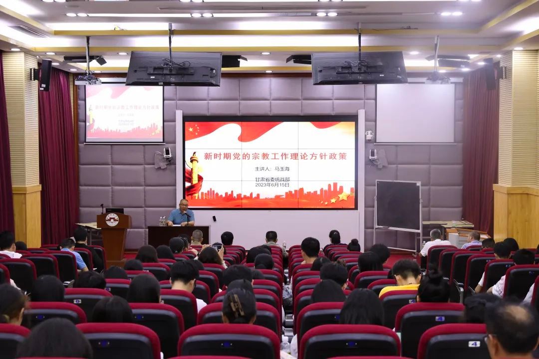 为深入贯彻落实全国宗教工作会议、全省宗教工作会议精神,积极宣传党的宗教工作政策理论和法律法规,进一步提升高校师生防范非法传教和抵御宗教渗透能力,省委统战部近期在各市县及重点高校启动了宗教政策法规宣传月活动。根据省委统战部统一部署,6月15日下午,甘肃省委统战部巡视员马玉海受邀到我校以《新时期党的宗教工作理论方针政策》为题做宗教政策法规宣传专题讲座。