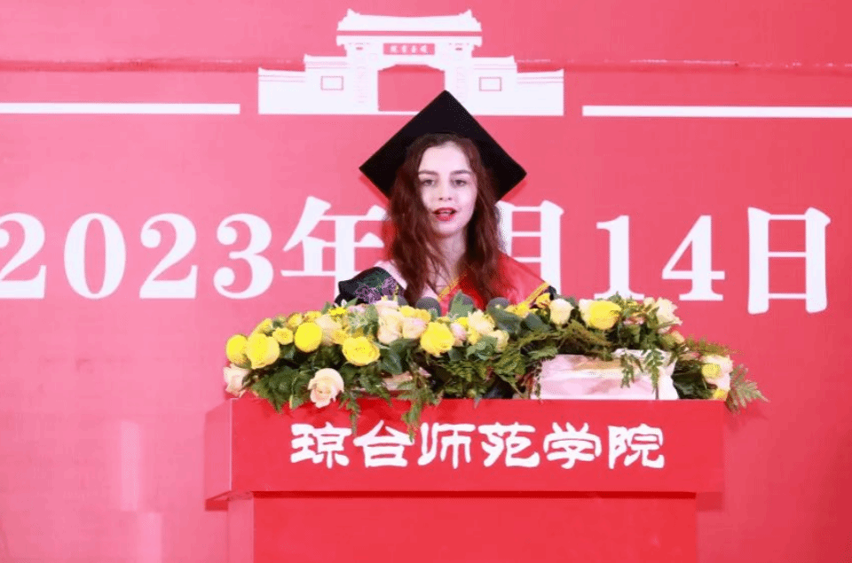 国际本科毕业生代表、2019级俄罗斯籍学生丽萨发言,她感谢学校提供的资源和老师无微不至的关怀,大学四年收获颇丰,亲历了海南自由贸易港建设,深入体验了中国文化,当好友谊使者和合作桥梁,讲好中国故事,为构建更加紧密的人类命运共同体作出自己的贡献。