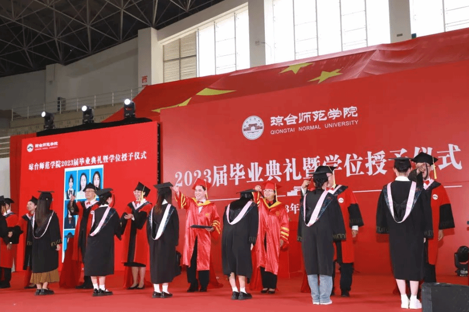 毕业典礼在雄壮的国歌声中拉开帷幕。毕业典礼上,工作人员宣读了《关于表彰2023届优秀毕业生 三好学生 优秀学生干部的决定》《关于表彰我校2023年优秀考研学生的决定》《琼台师范学院关于同意黄志圣等1187名2023届专科毕业生毕业的决定》《琼台师范学院关于同意曹鸿丹等2052名2023届普通高等教育本科毕业生毕业的决定》 《琼台师范学院关于授予陈景华等2110名本科毕业生学士学位的决定》。学校领导、学院领导向受表彰毕业生代表颁发荣誉证书。