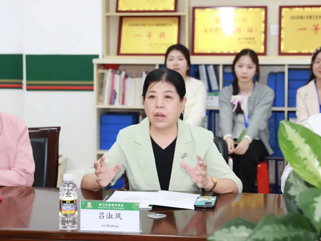 吕治国一行与海口江东枫叶学校相关负责人和我校实习生开展座谈交流,就学校实习生的实习工作情况进行了深入交流。海口江东枫叶学校小学校长吕淑凤对我校实习生的实习表现给予了较高的评价,她谈到,实习生们虽然在课堂教学上略显青涩,但素质较高、学习能力强、能吃苦并充满活力与正能量,经过实习期间的学习与锻炼,一定能持续提升课堂经验和能力。她希望,实习生们能够勇担责任,树立教师情怀,坚持终身学习的理念,落实立德树人根本任务,为培养德智体美劳全面发展的社会主义建设者和接班人而不懈奋斗。她表示,希望双方就校校合作、人才培养、专业建设、实习就业等方面深入交流,形成良性学习的状态,持续合作实现共赢。