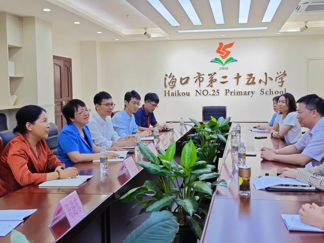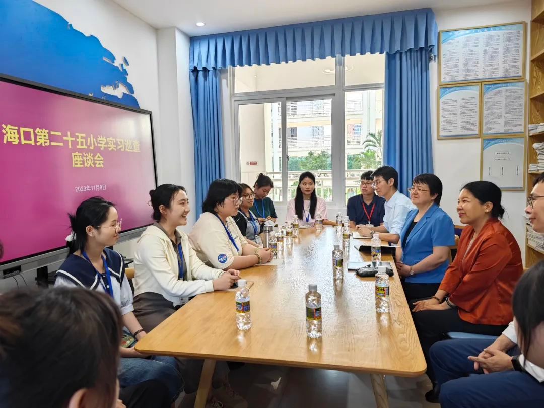 刘湘洪一行与二十五小相关负责人和我校实习生开展座谈交流,就学校实习生的实习工作情况进行了深入交流。刘湘洪听取二十五小领导对我校实习生的实习表现给予了较高的评价,她代表学校向二十五小校领导和老师们对我校实习生的无私指导和照顾表示衷心感谢。她谈到,我校正在贯彻落实“876”发展目标和“1234”人才培养计划,积极采取“请进来”与“走出去”相关举措,提高我校办学水平,用实际行动回应海南自贸港建设对基础教育提出的更高要求。她表示,二十五小是海南的基础教育名校,拥有先进的教育理念、突出的办学特色和丰富的教学经验,希望二十五小与我校深化人才培养与交流、共同开展课题研究,共同为推进海南基础教育的高质量发展贡献力量。