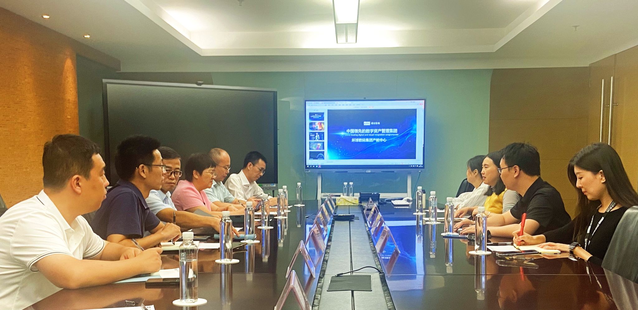 交流期间,刘湘洪校长一行参观了环球数码集团的企业文化展览馆,并在特色影厅中观看了宣传片,了解公司创办20年来在影视制作和虚拟现实技术等领域的技术实力和应用成果。