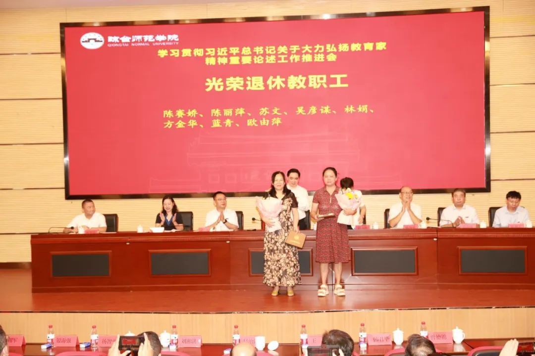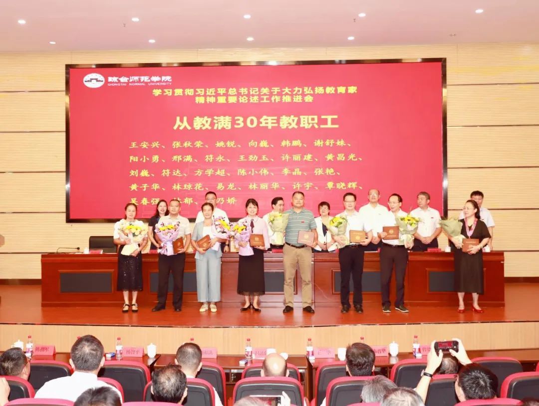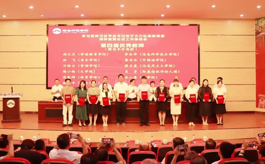 大会上,招生就业工作处林琼花作为教育工作先进集体代表发言;文学院辅导员马中力作为先进教育工作者代表发言;学前教育学院郑天竺作为优秀教师代表发言;科研处张艳作为从事教育工作满30年教职工代表发言。