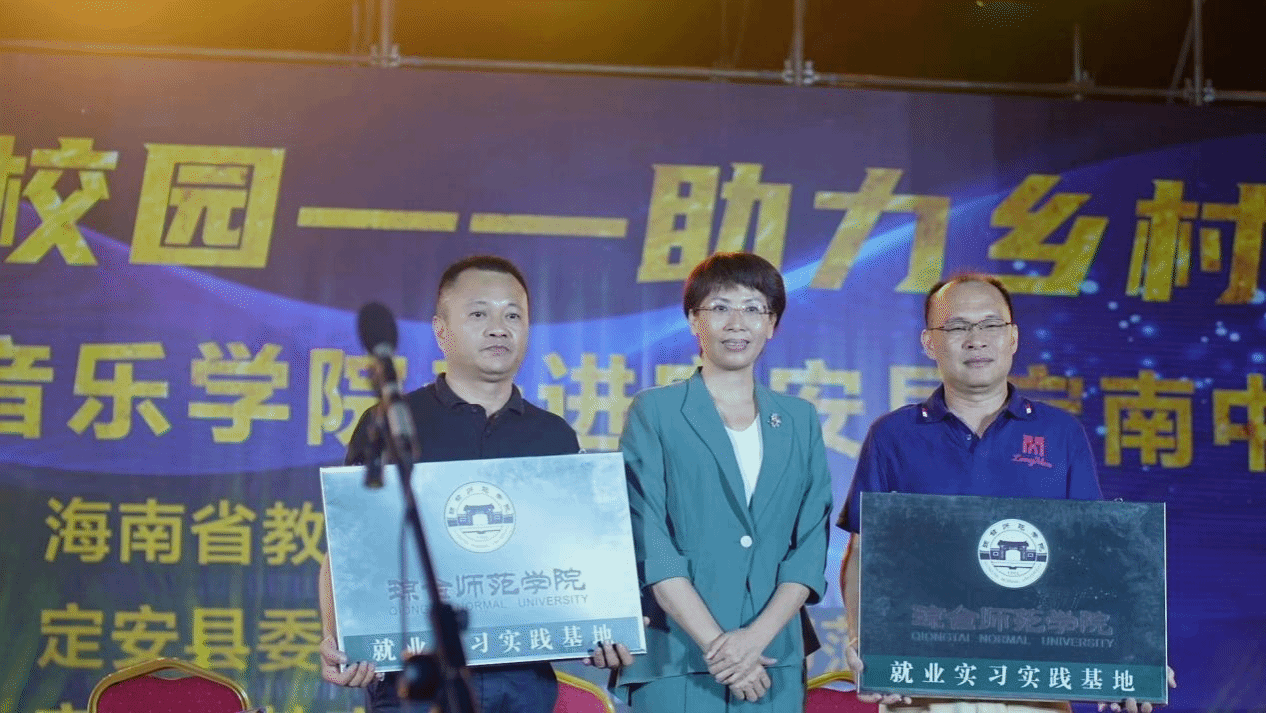 晚会前,陈晖阳为定安县龙门镇和定安中学授予琼台师范学院实习基地牌匾。我校音乐学院与龙门镇镇委镇政府签订《琼台师范学院音乐学院助力乡村振兴帮扶协议》,与定安中学签订《琼台师范学院音乐学院帮扶定安中学艺术特色教育协议》。