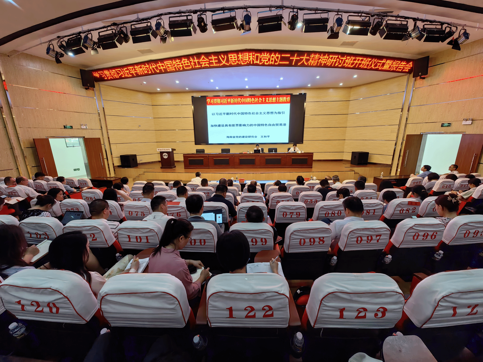 为深入学习贯彻习近平新时代中国特色社会主义思想和党的二十大精神,4月21日,我校在桂林洋校区图书馆报告厅召开学习贯彻习近平新时代中国特色社会主义思想和党的二十大精神研讨班开班仪式暨报告会。海南省委党校原常务副校长、海南省党建研究会的会长王和平教授受邀作题为《以习近平新时代中国特色社会主义思想为指引 加快建设具有世界影响力的中国特色自贸港》专题讲座。会议由校党委副书记陈晖阳主持并做开班动员讲话。