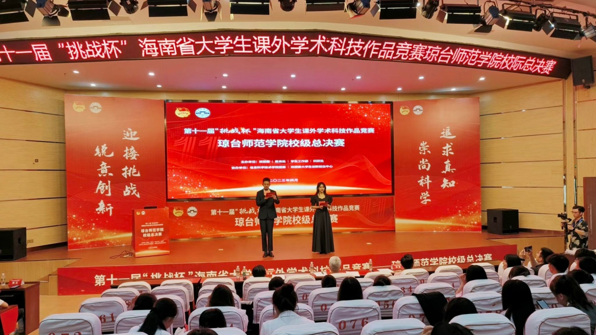 为深入贯彻党的二十大精神,进一步引导我校大学生培养科学精神,积极学习科学知识和科学方法,踊跃投身科技创新驱动发展战略,在加快建设科技强国上贡献青春力量,2023年4月16日,校团委在图书馆报告厅和创新创业中心举行第十一届“挑战杯”琼台师范学院大学生课外学术科技作品竞赛校级总决赛,校级总决赛由信息科学技术学院团委承办,校团委全体人员、各项目团队指导老师、项目组成员参加本次活动。