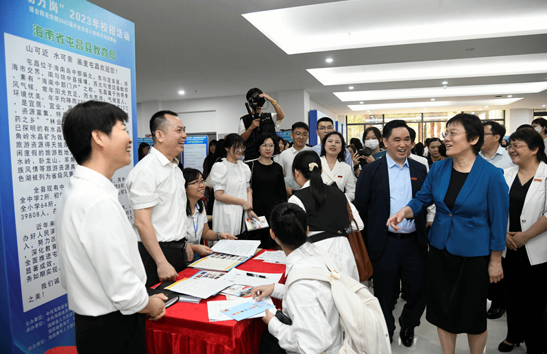 本次幼小教师专场招聘会由海南省委、省政府主办,省委组织部(省委人才发展局)、省人力资源和社会保障厅(省人力资源开发局)、省教育厅联合我校承办。在学校书记校长访企拓岗的专项行动下,邀请到陵水黎族自治县教育局、屯昌县教育局等省内五地市县教育局,海口市滨涯幼儿园、三亚外国语学校等60家用人单位参会揽才,提供900余个多类型岗位,其中教育行业岗位160余个,教师编制岗位近120个。吸引了2100余名2023届毕业生入场咨询求职,275人与用人单位初步达成就业意向,6人在现场被用人单位正式录用。