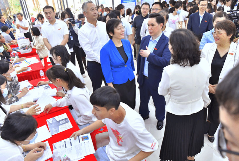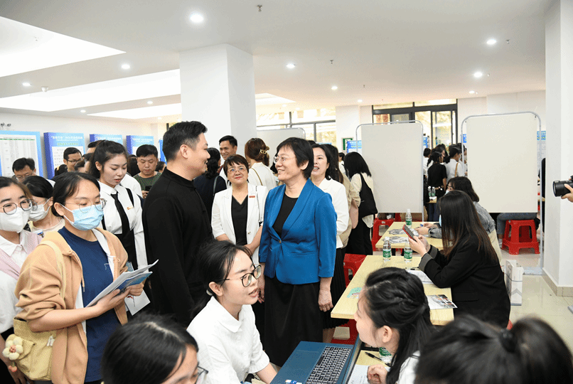 谢京一行来到招聘会现场,与幼小教师招聘培养市县教育局代表和招聘企业以及毕业生亲切交流,详细了解幼小教师的用人需求、薪资状况以及前来应聘毕业生的专业方向、求职意向和求职进展等情况。