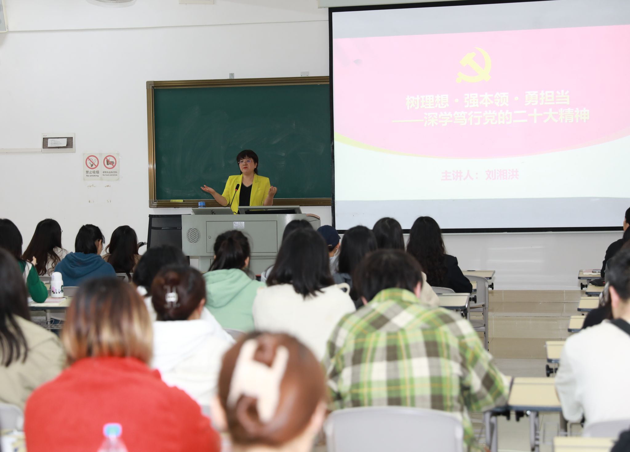 课堂上,刘校长围绕“党的二十大概况、为什么要学习二十大精神、如何做新时代好青年”三大主题展开宣讲,她首先介绍了党的二十大胜利召开的重大意义。随后,聚焦9个数字着重讲解报告的主要内容,带领与会师生共同回顾了过去五年工作和新时代十年伟大变革,开辟马克思主义中国化时代化新境界、以中国式现代化全面推进中华民族伟大复兴、全面建设社会主义现代化国家的目标任务、坚持党的全面领导和推进全面从严治党、应对风险挑战等7个方面重要内容,并与师生进行现场互动。