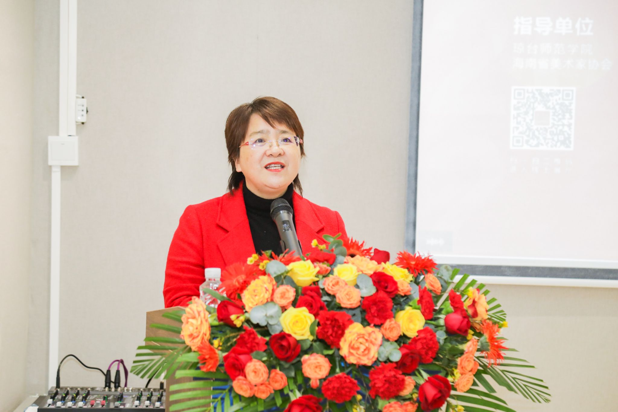 刘湘洪校长代表学校致辞。她指出,琼台师范学院是海南艺术教育的先行者,自1975年就开设了文艺班,至2023年已有48年的历史,为海南美术事业的发展做出了卓越贡献,为海南美术教育界输出了大量的人才。美术学院教师新作展是检阅教师近年来教学、科研、艺术创作成果的一项重要的学术活动,艺术创作研究中心的挂牌成立,更是琼台美术从实践引领升华至学术引领迈出的关键一步,将为今后海南美术以及美术教育的进步起到更好的推动作用。