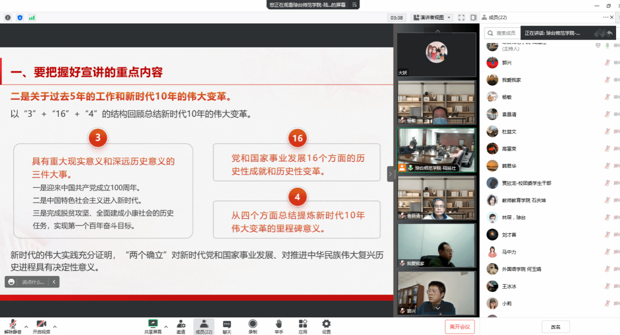 她强调,宣讲团成员应做到以下三点。一要坚持正确导向,力求全面准确。要严格按照党中央、上级党组织精神开展宣讲,让宣讲有高度、有深度、有温度。二要坚持全面系统,聚焦宣讲成果转化。要全面学习把握党的二十大精神丰富内涵,围绕党的二十大提出的一系列新思想、新观点、新战略、新举措,结合习近平新时代中国特色社会主义思想,习近平总书记考察海南时重要讲话精神,结合学校发展实际,以讲促研,走深走实成果转化。三要加强组织领导,落地落细宣讲安排。要迅速行动起来,精心部署安排,形成宣讲合力,切实推动广大师生全面学习、全面把握、全面落实党的二十大精神,迅速把学习宣传贯彻党的二十大精神推向高潮。