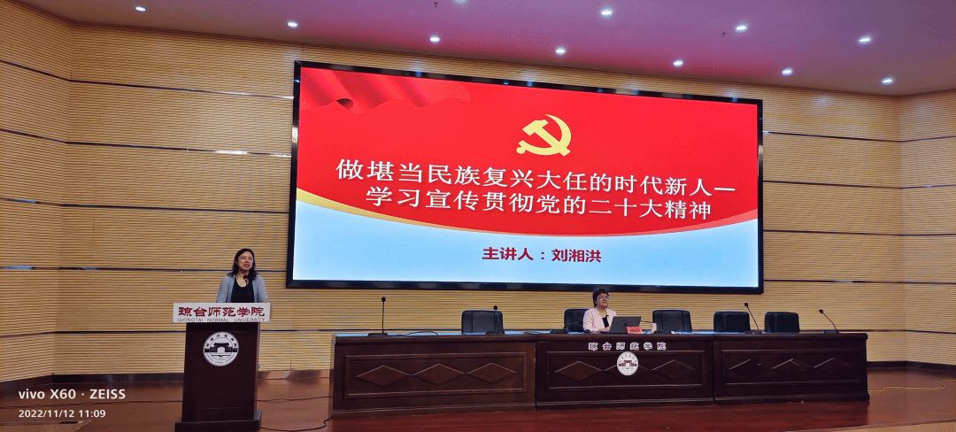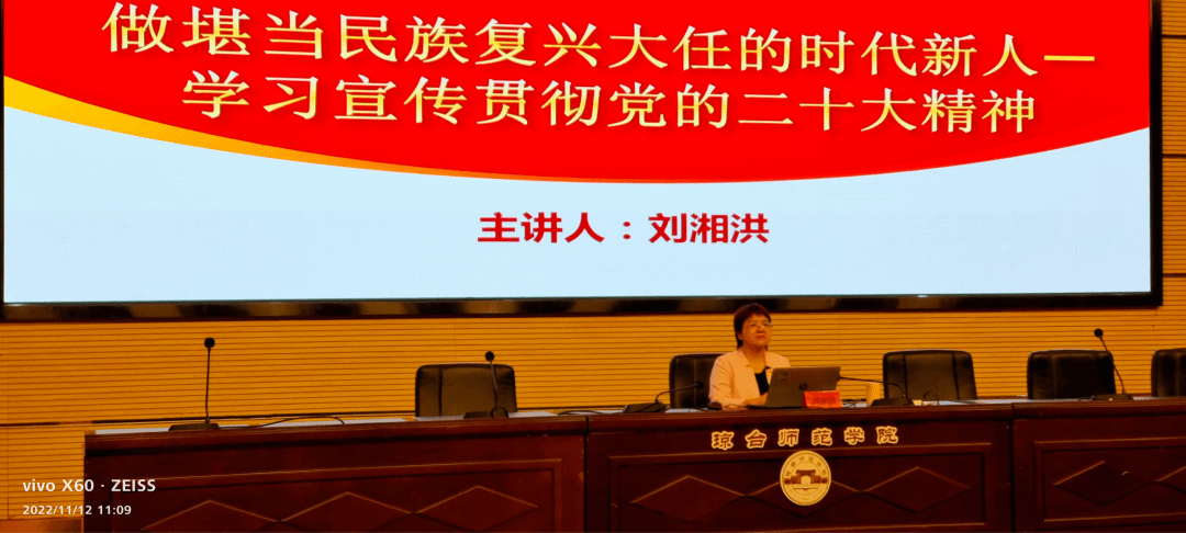 11月12日,海南青年学生党校2022年第二期发展对象培训班在琼台师范学院图书馆报告厅正式开班,刘湘洪校长为学员上开班“第一课”:《做堪当民族复兴大任的时代新人--学习宣传贯彻党的二十大精神》。