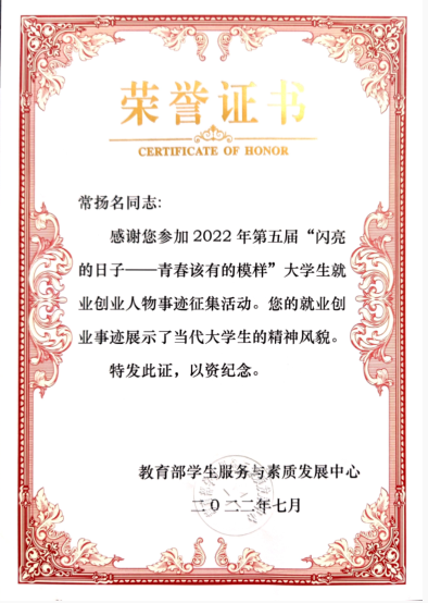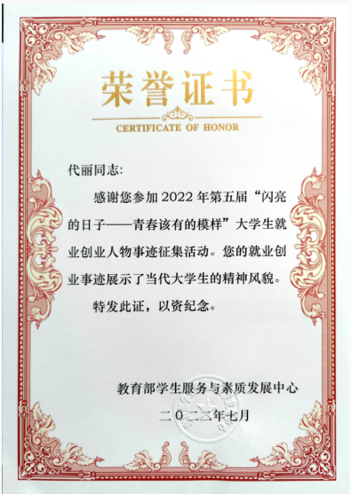 本次评选由教育部全国高等学校学生信息咨询与就业指导中心举办,经过学校初选申报、海南省人力资源开发局复审推荐以及教育部遴选,海南省共有15名高校学生入选全国第五届“闪亮的日子—青春该有的模样”大学生就业创业典型人物。其中,我校2名学生获此殊荣,分别为2020体育营运与管理班常扬名同学荣获“军营大学生战士典型人物”称号;2021届小学教育1班代丽同学荣获“大学生基层就业典型人物”称号。我校入选人数属于海南省内高校入选人数比例最高的两所高校之一。