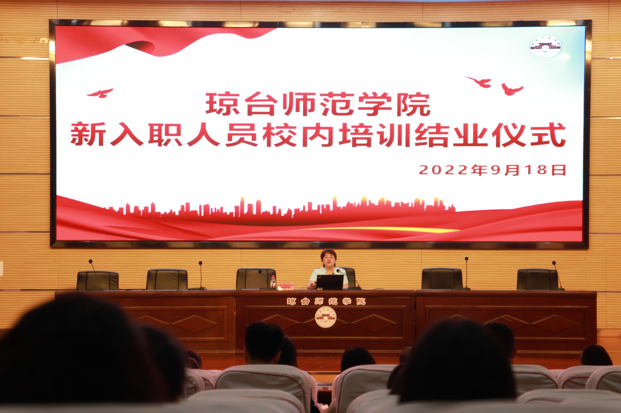 校长刘湘洪在结业典礼上致辞。她要求新进教师们一定要牢记总书记教导,争做“四有”教师,并提出三点具体要求:一要牢记立德树人根本任务,践行“为党育人、为国育才”的教育使命。以深厚的学识修养赢得尊重,以高尚的人格魅力引领风气,着力培养担当民族复兴大任的时代新人。二是提高政治站位,坚定不移地以习近平新时代中国特色社会主义思想铸魂育人。不断提升政治判断力、政治领悟力、政治执行力,为办好人民满意的教育,为海南的自贸港建设贡献力量。三是要恪守“行为世范”的职业道德,坚持“知行合一”的学问之道。认真落实新时代教师职业行为十项准则,加强知识储备,练就过硬本领,在教育教学上与时俱进,在课题研究上攻坚克难,成为政治素质过硬、业务能力精湛、育人水平高超的高素质教师。