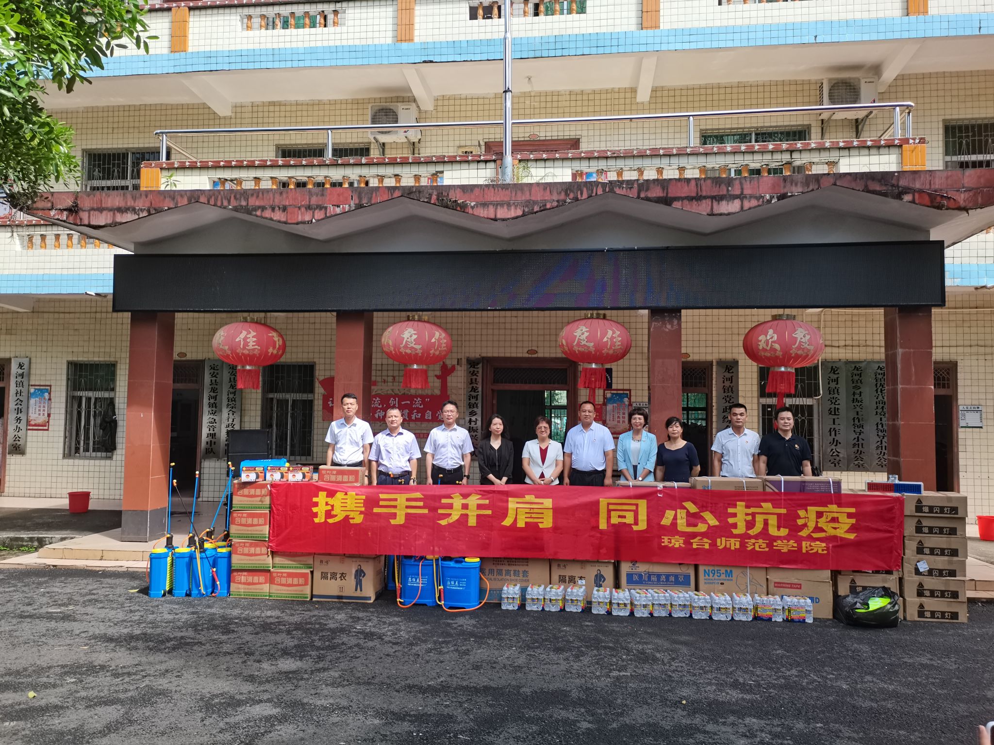 定安县龙河镇水竹村是我校驻点帮扶村,当了解得知水竹村疫情防控工作物资消耗情况之后,立即采取措施紧急协调调拨抗疫物资。8月26日上午,校长刘湘洪、党委副书记陈晖阳带领党政办、组织部等相关部门负责人前往水竹村,代表琼台师范学院向龙河镇捐赠防护服、N95口罩、医护隔离面罩等价值5万元的防疫物资。