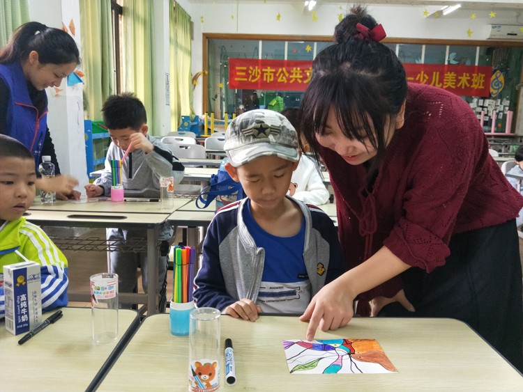 在教学过程中,三沙市美术家协会马杰主席走进各班,深入了解各班开班情况,并做具体指导。
