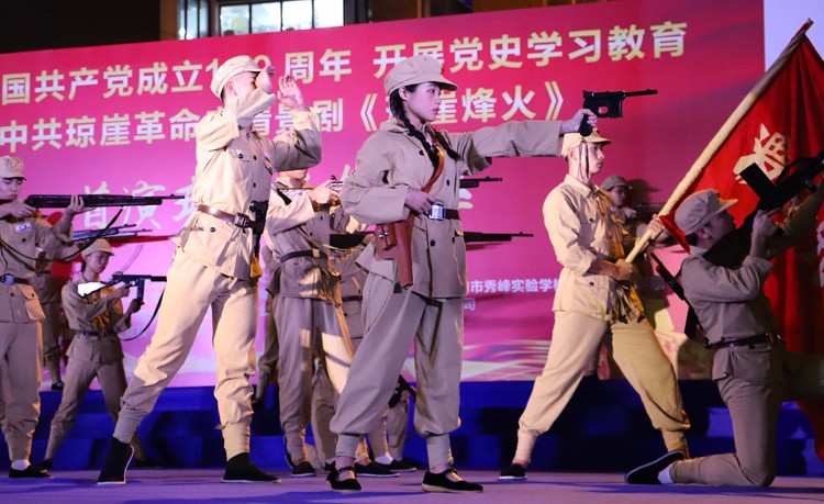 6月19日,位于海口市龙华区中山街道的金棕榈商业广场上热闹非凡,由我校学子倾情演出的庆祝中国共产党成立100周年大型献礼情景剧《琼崖烽火》首演圆满成功。我校党委书记李湖,副校长王显芳,及龙华区、中山街道等地领导观看演出。