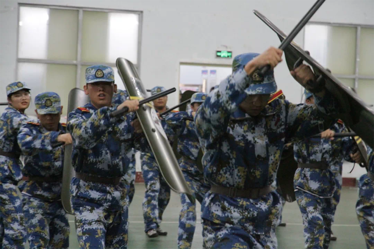 军训科目表演环节,军体拳,擒敌拳,警棍盾牌术,旗语,战术,格斗术,士兵健身操队列整齐,动作流利,士气昂扬,充分展示了琼台学子朝气蓬勃,奋发向上的精神风貌。