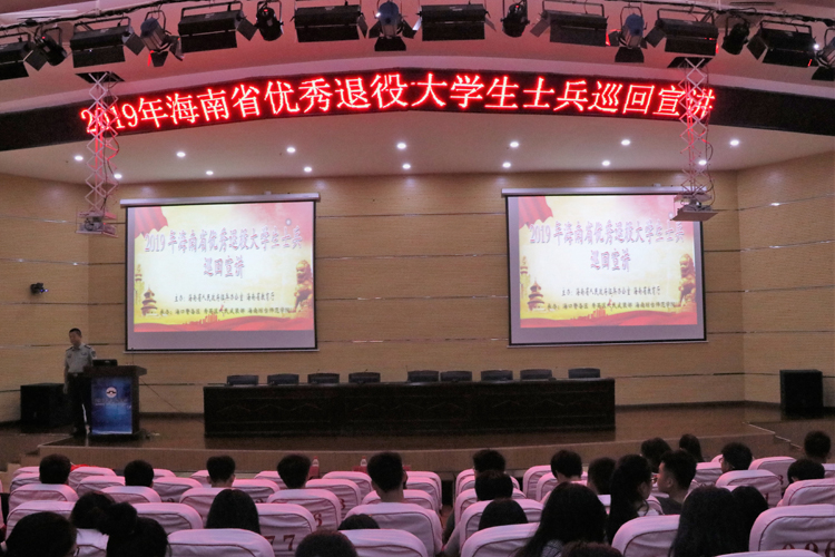 4月25日上午,琼台师范学院图书馆报告厅迎来了一群可敬的人——优秀退役大学生士兵来我校巡回宣讲。宣讲团由省军区动员局副局长程佑祥、秀英区武装部部长效志强带队,报告厅座无虚席,有的学生甚至站着聆听完宣讲。