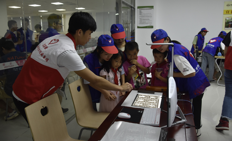 下午,在桂林洋校区学生食堂品尝吃完饭后,小朋友们随志愿者们来到我校图书馆及美术馆,体验了图书馆的现代化朗读设备及我校美术系学生创作的艺术感十足的作品。
