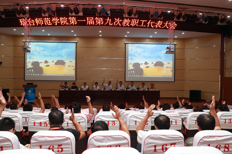 第一届第九次教职工暨工会会员代表大会在庄严的国歌中正式开始。首先校长办公室颜为健副主任作《琼台师范学院章程》(审议稿)起草情况报告,对章程的主要内容进行了概括与说明。人事处陈拥军副处长向大会汇报了《关于调整绩效工资的意见》(审议稿)起草情况,并对我校绩效工资实行基本原则、奖惩机制等内容将行了介绍。宣传统战部郭志东部长对《琼台校歌》的历史及创作背景进行了汇报。