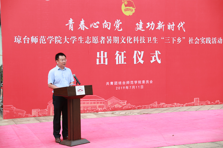 仪式上,学生处处长兼团委书记柳善文介绍了我校2019年暑期社会实践活动组织筹备情况,并对实践团队接下来开展的工作进行了详细部署。校团委副书记李赞宗宣读琼台师范学院2019年大学生暑期社会实践团队立项资助结果。荣获2018年全国大中专学生暑期社会实践“三下乡”活动优秀团队指导教师姚淑女老师以及荣获2018年度海南省暑期社实践优秀个人、2019年暑期社会实践团队负责人中文系钟传旭同学分别代表指导老师和学生发言。