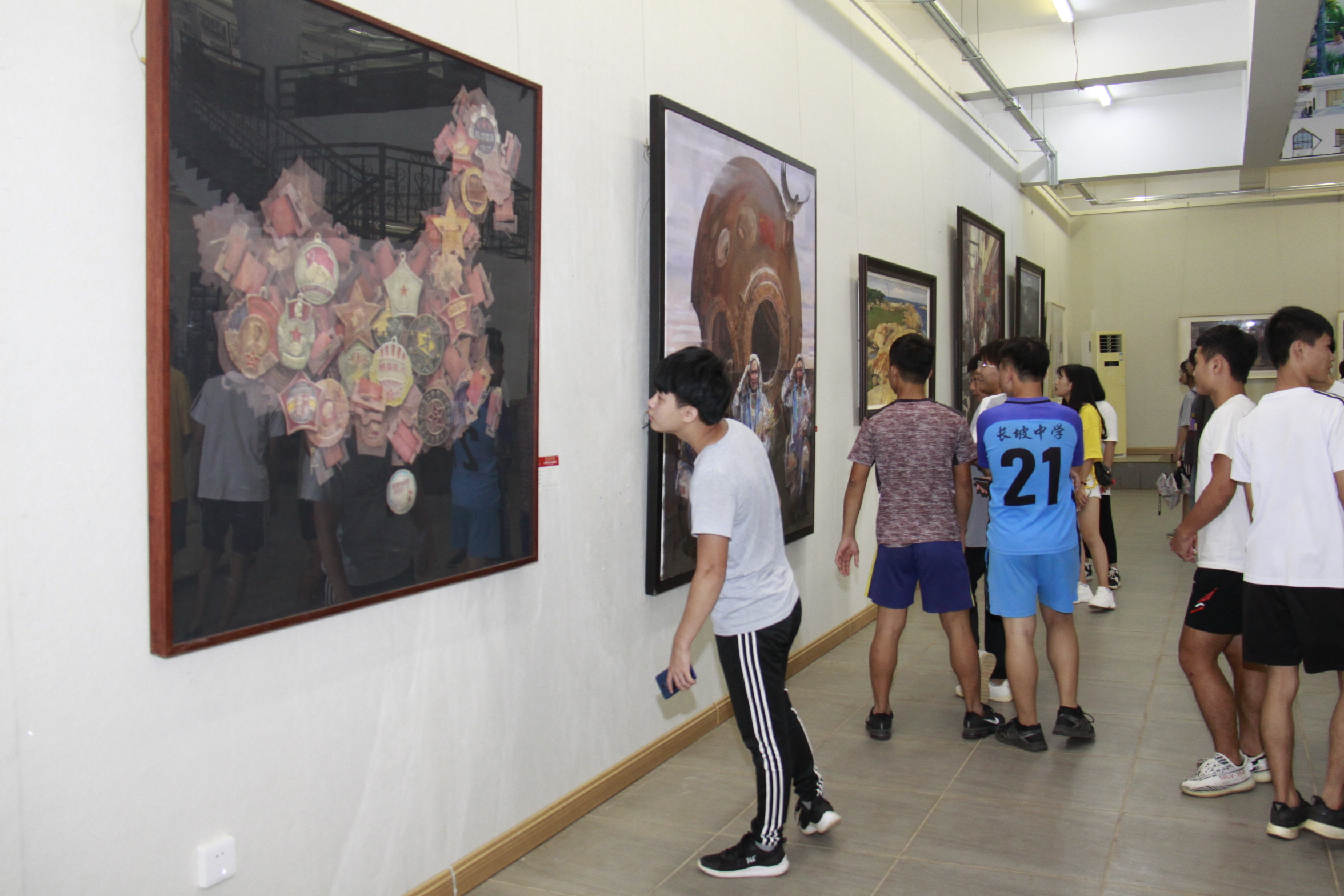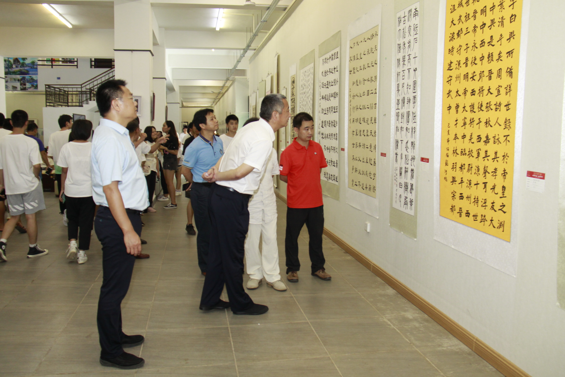 为深入特色社会主义思想和党的十九大精神,深入推进″不忘初心 、牢记使命"主题教育活动,丰富广大群众的文化生活,弘扬中国优秀文化;在中华人民共和国成立70周年之际,学校于9月29日下午举办了“礼赞新中国 、奋进新时代”美术、书法、摄影作品展。校党委李湖书记、王华副校长观看展览。党政办、宣传部、美术学院负责人及师生代表百余人参加开幕式。