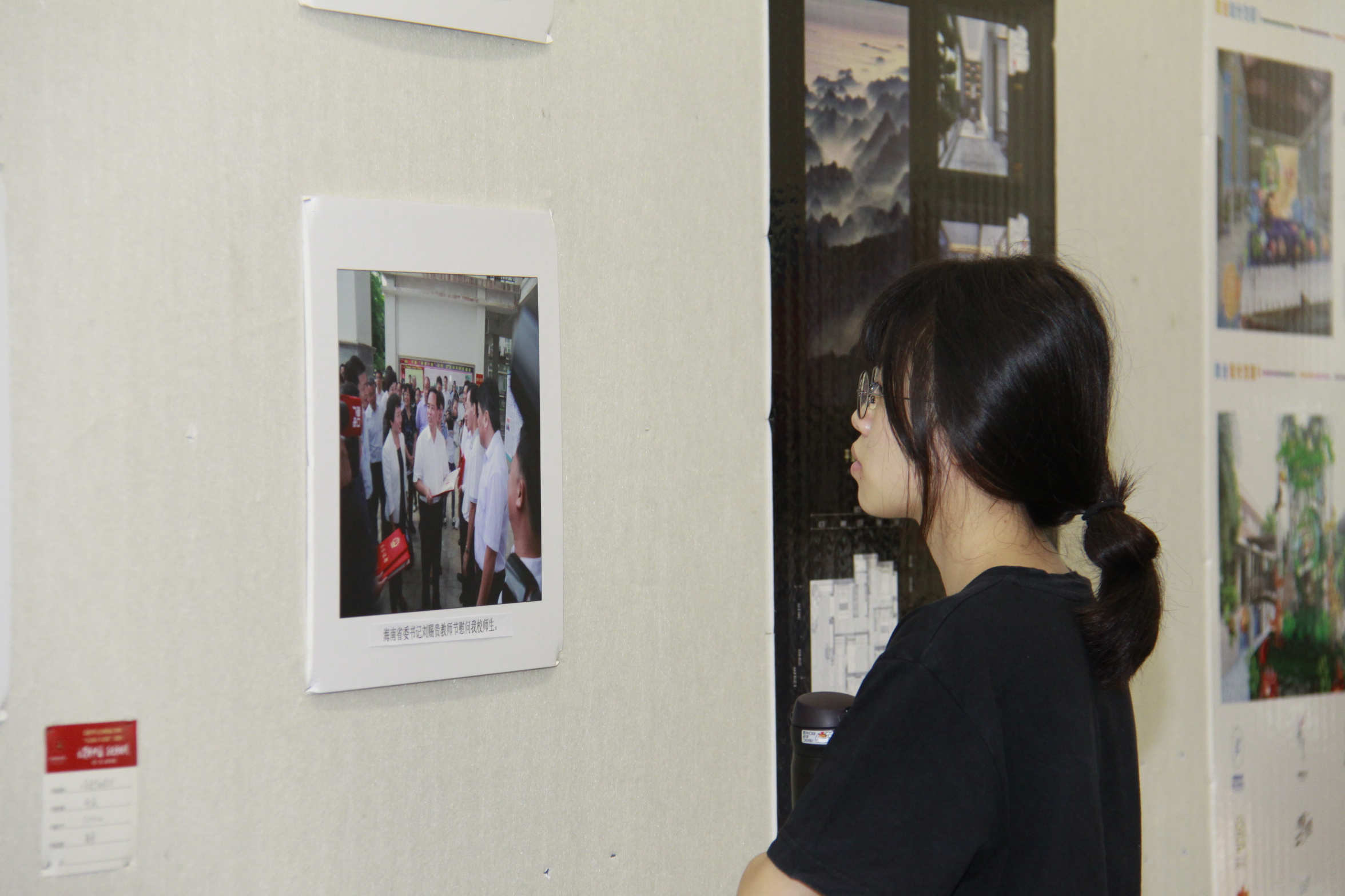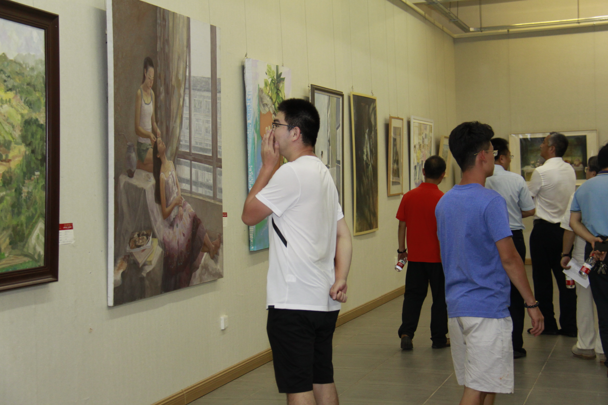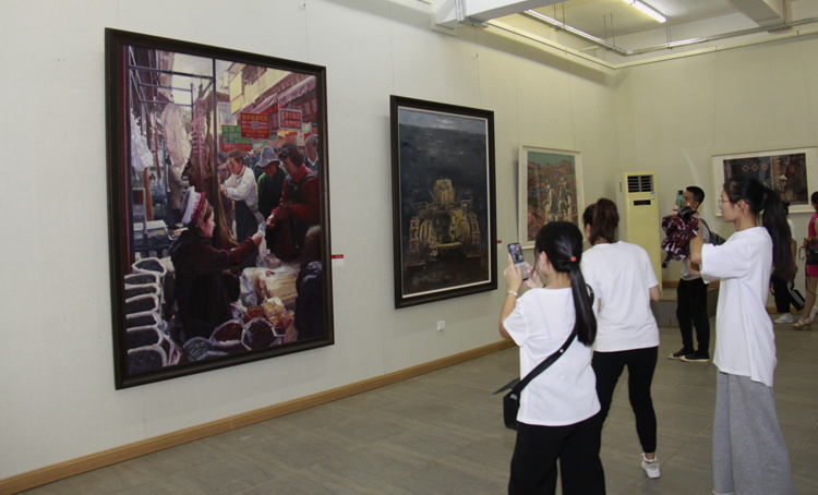 开幕式后,与会人员前往展区饶有兴致地观看了参展作品,对作品的立意、内涵、艺术流派、表现形式等进行了解,对我校师生的艺术造诣,以及他们作品中洋溢的爱党、爱国、爱校的热情给予充分肯定。
