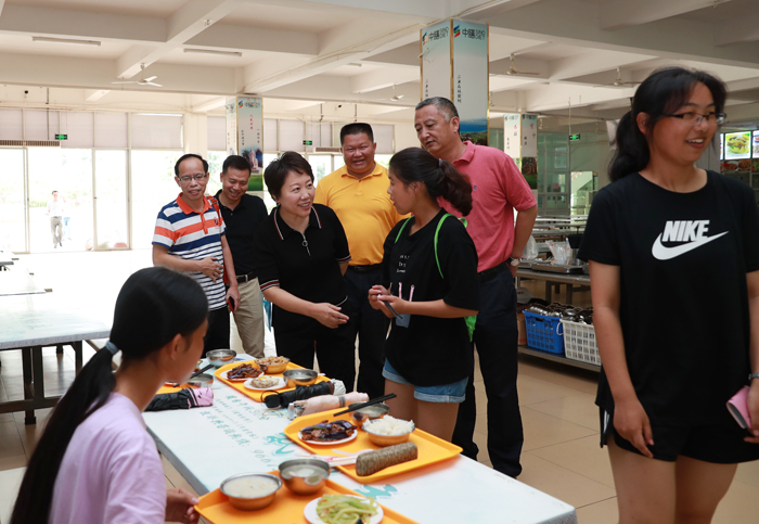 曹厅长现场一边检查,一边听取我校预防台风准备工作。在校道上,曹厅长拦住几名学生,详细询问预防台风情况,“你们知道有台风要来吗?你们做好了预防台风的准备吗?”同学们回答:“知道台风山竹要来,学校已经通知我们做准备了,我们也买了水、泡面等,学校还要求我们不能外出。”曹厅长听了学生回答开心地笑了,她还告诉同学们一定要注意安全,尽快回宿舍避风。在学校食堂,曹厅长了解了饭菜准备情况、问正在就餐的学生饭菜价格等问题,她要求学校一定要做好饭菜的供应准备,保证台风期间学生有饭吃,同时确保食品安全。曹厅长走进学生宿舍,和学生聊宿舍预防台风的准备工作。