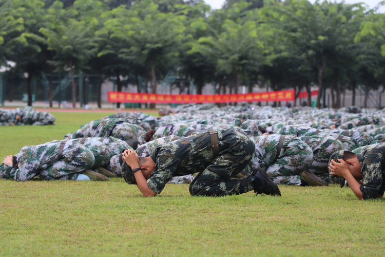 九月十八日十时,一声凄厉的防空警报划破桂林洋的天空,我校三千余名正在进行军训的新生在教官的指挥下,迅速、有序地从学校的各个方位撤离,到达操场后,同学们双手抱头,跪趴在草地上,保持此姿势待命至防空警报解除。此后,带训教官指挥整队,向主席台报告集合情况,演练总结大会随及开始。