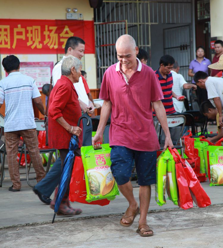 拿着物资回家的村民