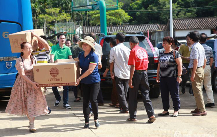 村民与老师们一起卸下物资