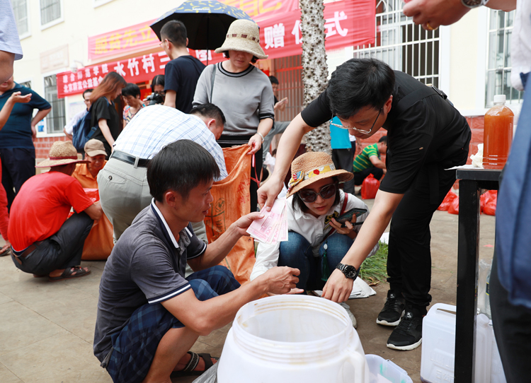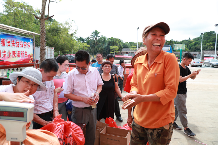 捐书仪式后,水竹村的小广场上人头攒动、越发热闹,琼台教职工积极响应省委省政府的倡议主动踊跃以购代捐,认购贫困户的农产品。水竹村贫困户带来的本地养、阉鸡、蜂蜜、黑豆等深受欢迎,不一会儿就销售一空,活动气氛如火如荼,农户们忙得不亦乐乎。