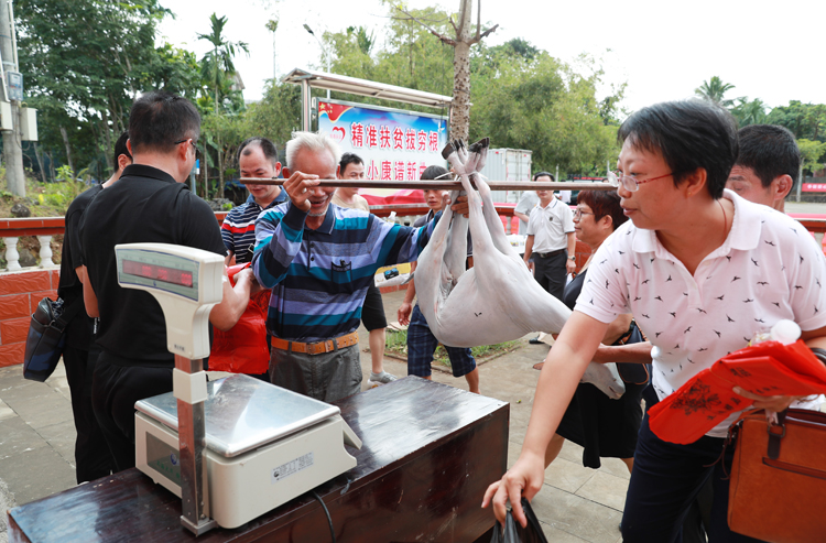 “阉鸡再来三十只。”“黑豆多拿五十斤。”这不是普通农贸市场的叫卖,而是定安县水竹村扶贫现场,我校的教职工正在以购代捐的模式帮助贫困的乡亲们“去库存”。成规模、大额量、多批次的购买,让贫困户们高兴得合不拢嘴:“这下,咱的东西可不愁卖啰”。
