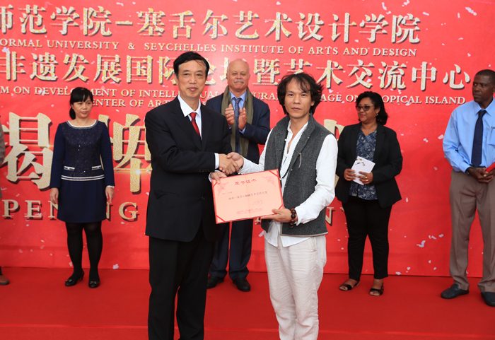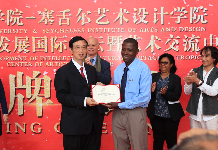随后,在美术楼广场,曹阳校长和大卫•安德里市长代表双方签署了在开展师生互派、技艺培训、学术交流等方面内容的合作意向书,并为两校艺术交流中心揭牌,曹阳校长还向塞舌尔椰雕工艺美术家唐纳蒂安•弗雷米诺和海南省非遗传人、著名椰雕艺术家吴名驹颁发了交流大使荣誉证书。参加活动的嘉宾和师生参观了中非手工艺术作品及美术教育成果展。