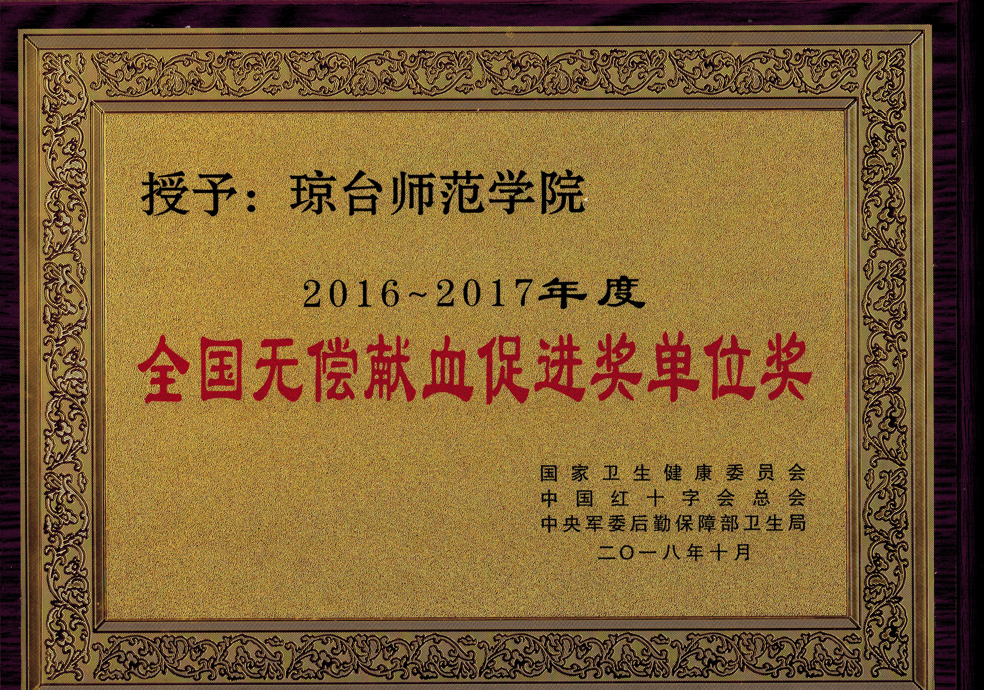 无偿献血促进奖是由国家卫生健康委员会等三部委联合颁发给为无偿献血事业作出贡献的单位和个人的国家级荣誉,每两年进行一次表彰。无偿献血是一项公益性的社会系统工程,也是社会精神文明建设的重要组成部分,是实现"健康中国,全民健康"的重要保障,我校将继续倡导师生员工弘扬救死扶伤的人道主义精神,为他人着想,参与无偿献血事业,为推动社会文明进步和实施健康中国战略贡献力量。