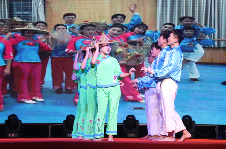 随后文艺演出部分在大合唱《迎风飘扬的旗》正式开始,《迎风飘扬的旗》载歌载舞给观众带来强大的视听冲击;舞蹈《春采》令人在海南的冬天感受春天的颜色,更是充满希望的颜色。“亲爱的朋友我等你来海南,海南的朋友是你的靠山,”这首原创歌曲《我等你在海南》表现了海南人民的热情好客;朗诵《颂琼台》阐述了琼台几年来的变化,以及对于未来琼台发展的美好向往。“日出江南红胜火,春来江水绿如春”是舞蹈《春来江水绿如蓝》节目的来源,现场舞蹈更是带着一股清新之风。随后的舞剑表演《刀剑如梦》、舞蹈《船歌》和新疆舞《摘葡萄》、儋州调声《朝着时代来》、《新时代琼崖传习所》、舞蹈《心有翎兮》、歌舞《梦圆了》等等节目,形式多样,精彩不断,现场高潮迭起。