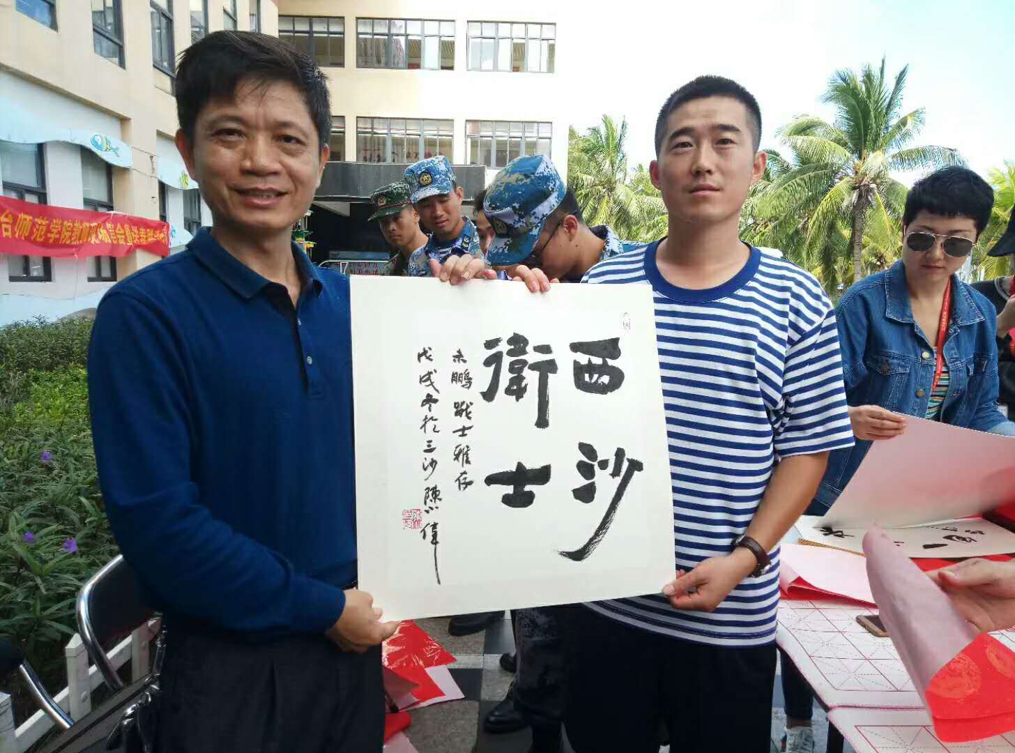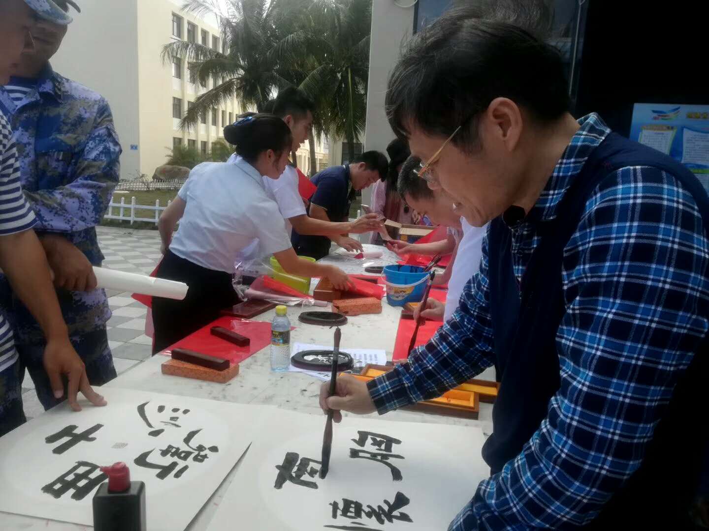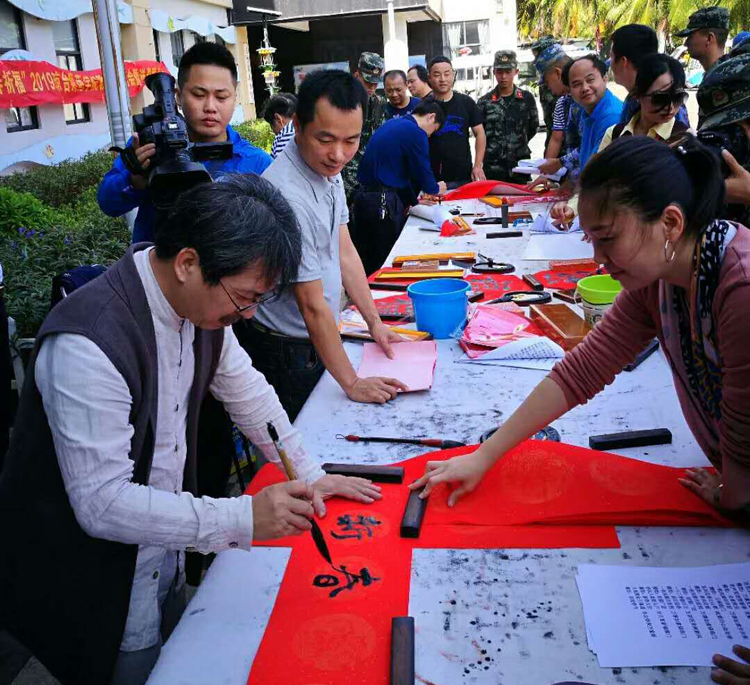 腊八过后就是年,戊戌狗年腊月初十上午(2019年1月14日)年味渐浓,我校党委委员、外语系书记曾德锦同志带领琼台书画名家一行9人,在三沙市永兴岛多处为当地居民现场泼墨挥毫写春联。
