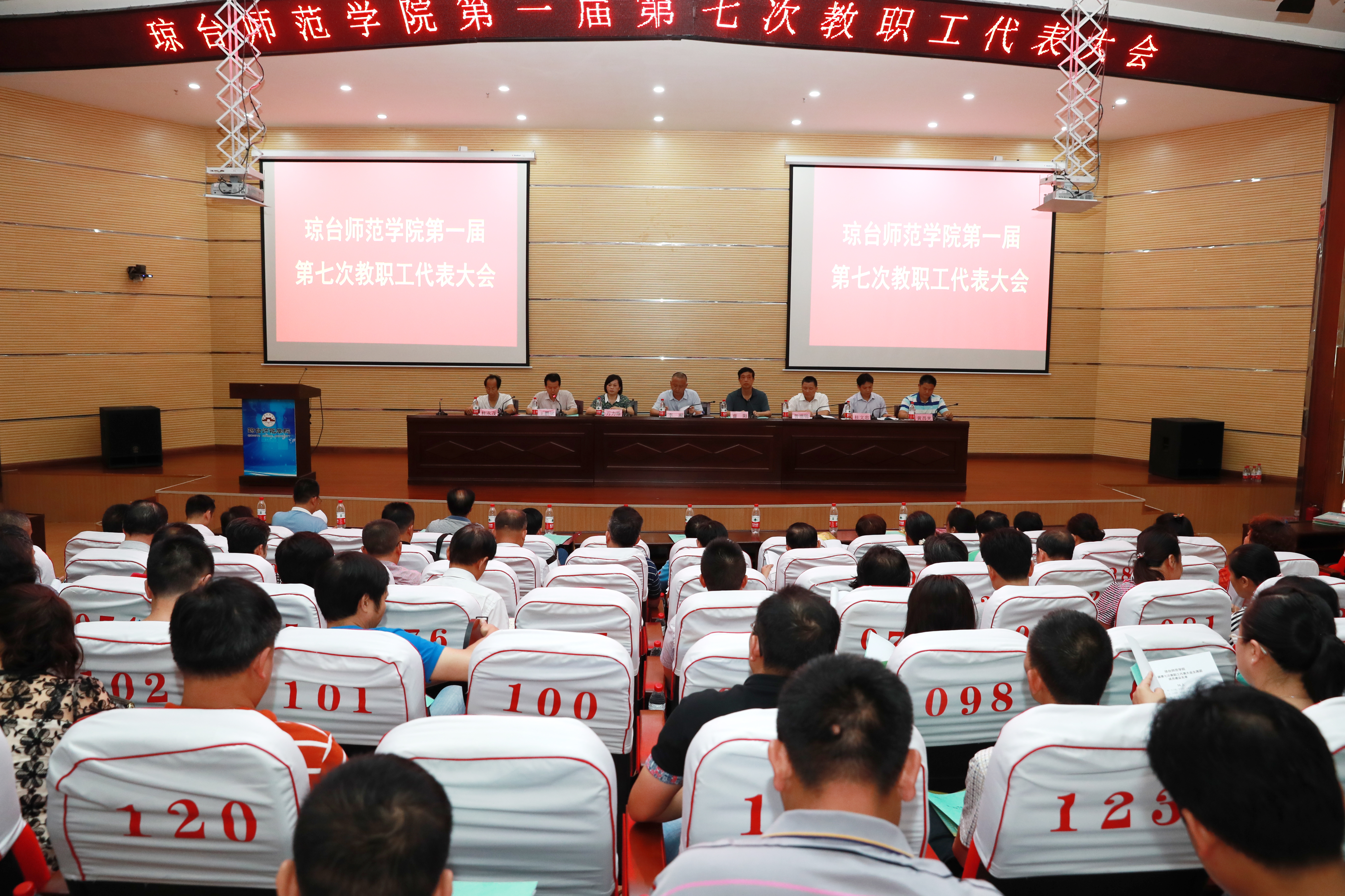 4月26日下午,琼台师范学院第一届第七次教职工暨工会会员代表大会在图书馆报告厅隆重举行,党委书记李湖,院长曹阳,副院长万力维,党委委员、外语系总支书记曾德锦出席会议,校工会副主席王鹏斌主持会议。本次大会应到正式代表人数94人,实到82人,符合法定人数。