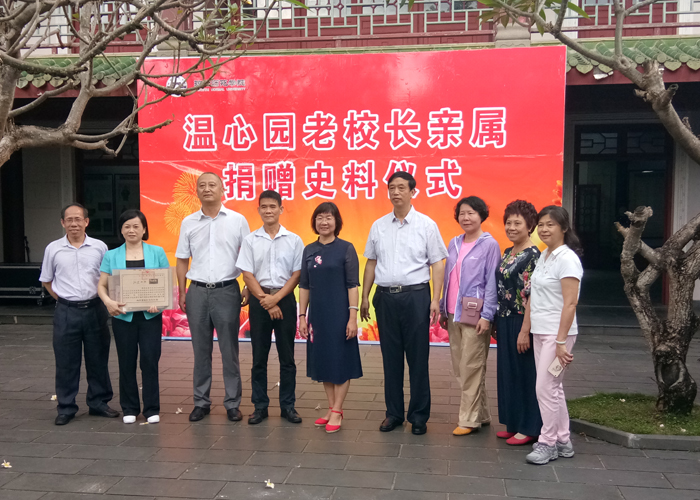 4月29号下午,我校已故的温心园老校长亲属温洁女士、温海先生带着珍贵的史料来到府城校区琼台书院,我校党委书记李湖、院长曹阳、副院长万力维,宣传统战部、校办相关人员迎接他们的到来,史料捐赠仪式在琼台书院内举行。