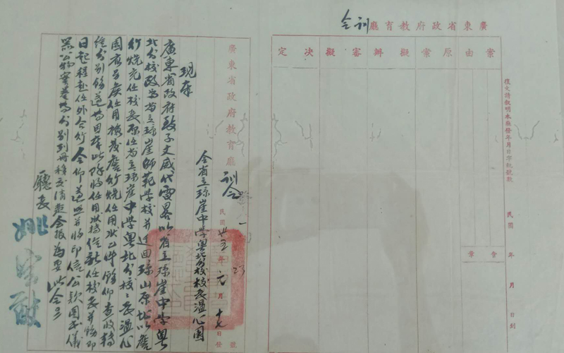 广东省政府教育厅给琼崖联合中学粤北分校校长温心园的训令