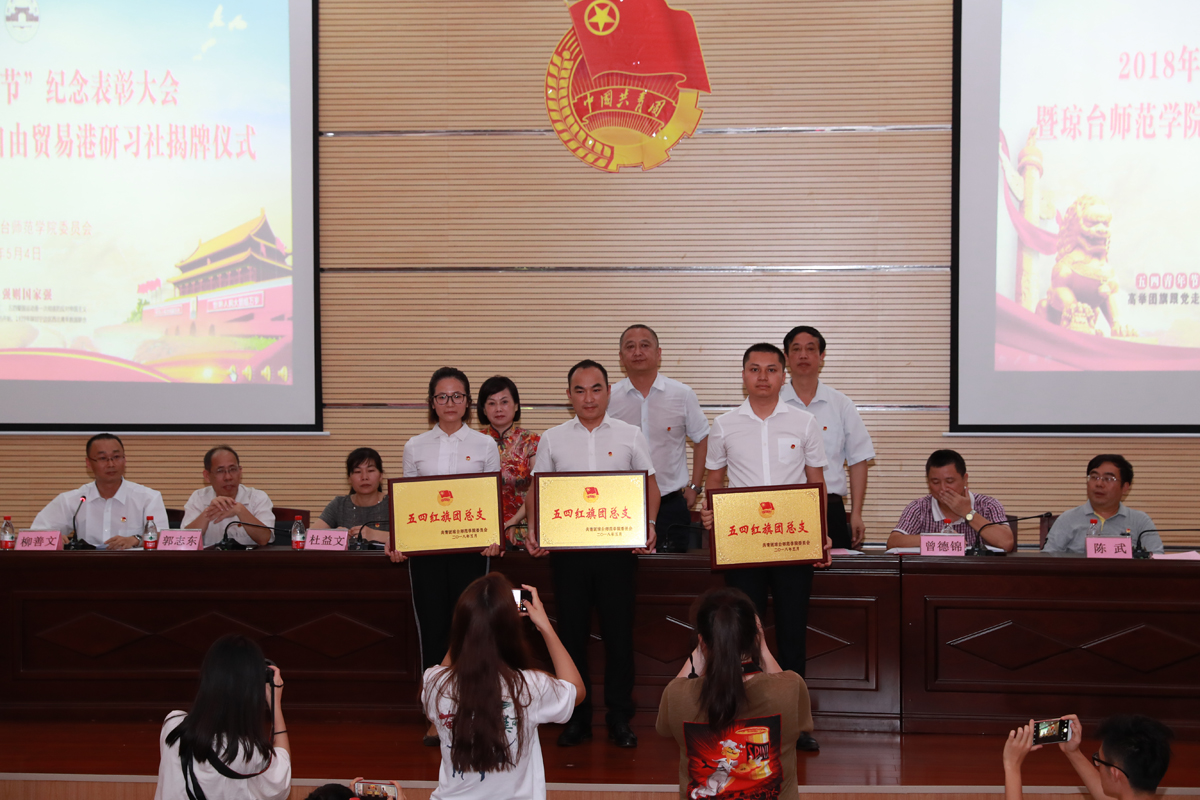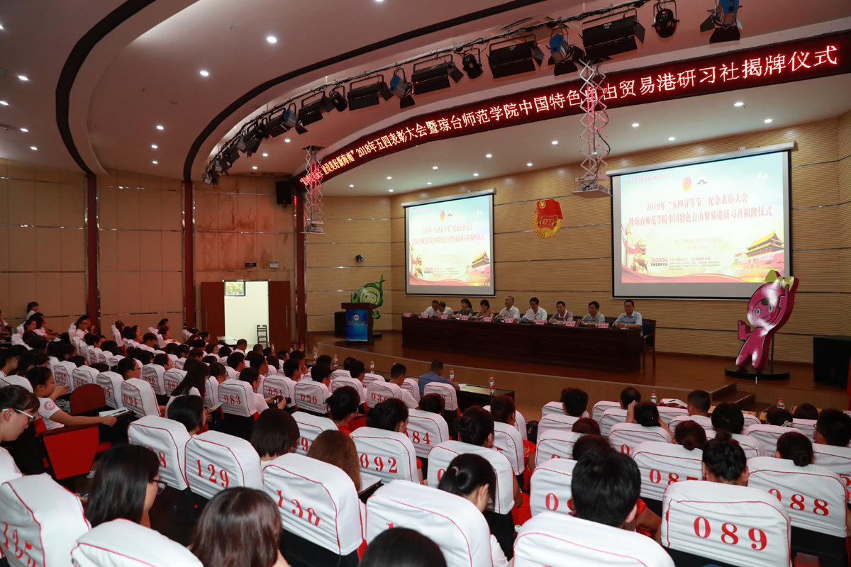 为纪念五四运动99周年,庆祝中国共产主义青年团成立96周年,表彰2017年共青团工作先进集体和先进个人及发布琼台师范学院共青团卡通人物形象,5月4日下午,我校在图书馆报告厅举行”我与特区共成长 建设美好新海南”2018年五四青年节纪念表彰大会暨琼台师范学院中国特色自由贸易区研习社揭牌仪式。校党委书记李湖、院长曹阳、副校长万力维、校党委委员曾德锦;党委办公室、组织部、宣传统战部、学生处、校团委等部门主要负责人;各院系党总支书记、团总支书记及团员团干代表参加此次大会。本次大会由校团委书记柳善文主持。