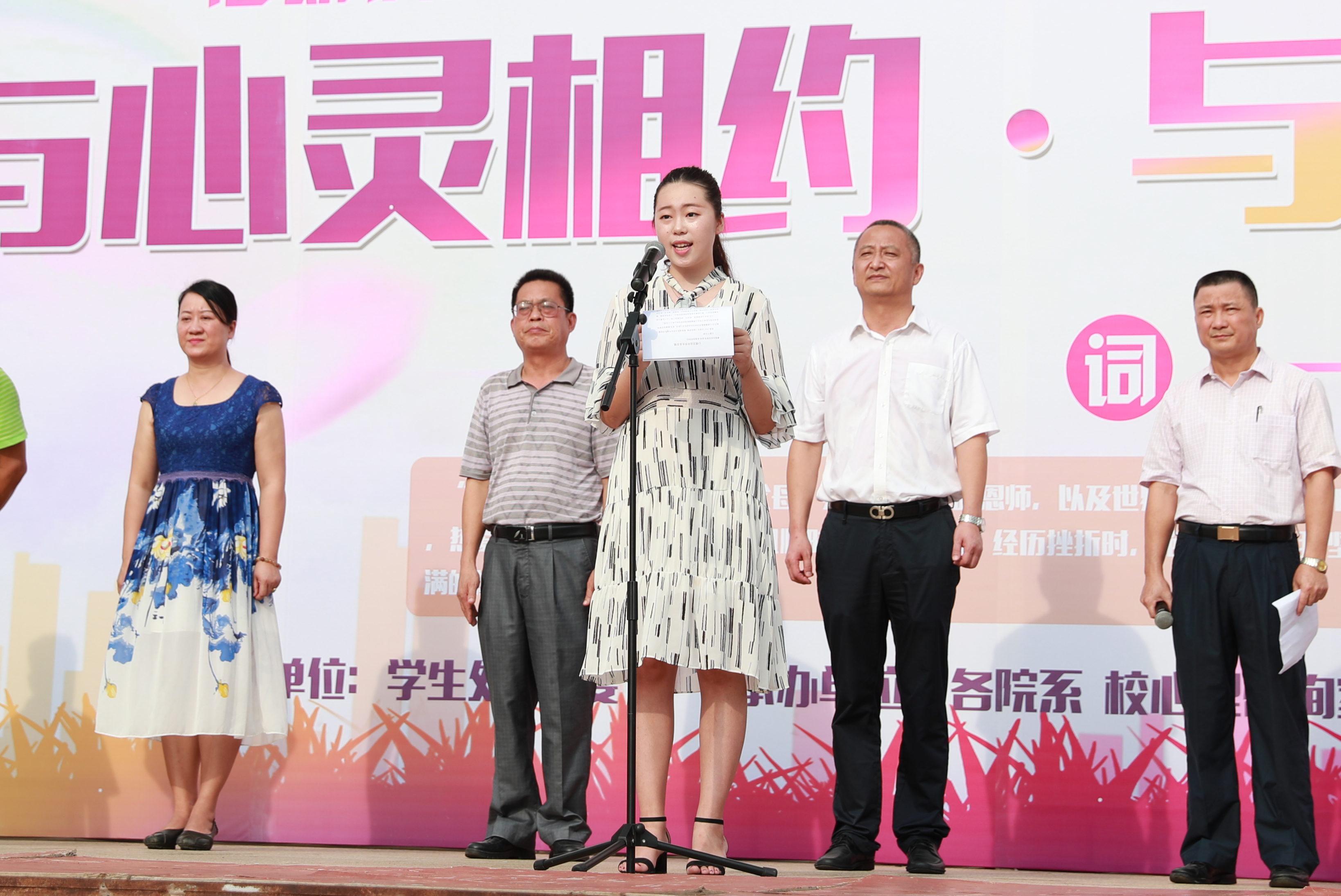 心理健康教育辅导员代表、体育系黄红梅老师上台发言,希望同学们在未来的生活中坚如磐石,韧如蒲苇,充满自信,正视自己,有需要的时候要勇敢地寻求心理帮助。学生代表罗轶同学上台发言,她表示作为大学生要关注自身心理健康,增强心理健康意识,提高心理调试能力,要让我们的心灵多一份宽容、多一份感动,多一点坚强,要对生命充满信心和敬意。