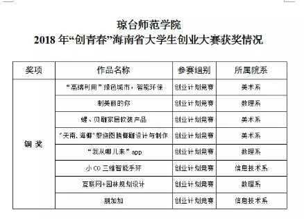 6月7日至8日,由共青团海南省委、海南省教育厅、海南省人力资源和社会保障厅、海南省工业和信息化厅、海南省科学技术协会以及海南省学生联合会共同主办、海南大学承办、海南省各高校协办的2018年“创青春”海南省大学生创业大赛决赛暨“挑战杯——彩虹人生”海南省职业学校创新创效创业大赛在海南大学隆重举行。我校在比赛中发挥出色,斩获了优秀组织奖及8个铜奖。