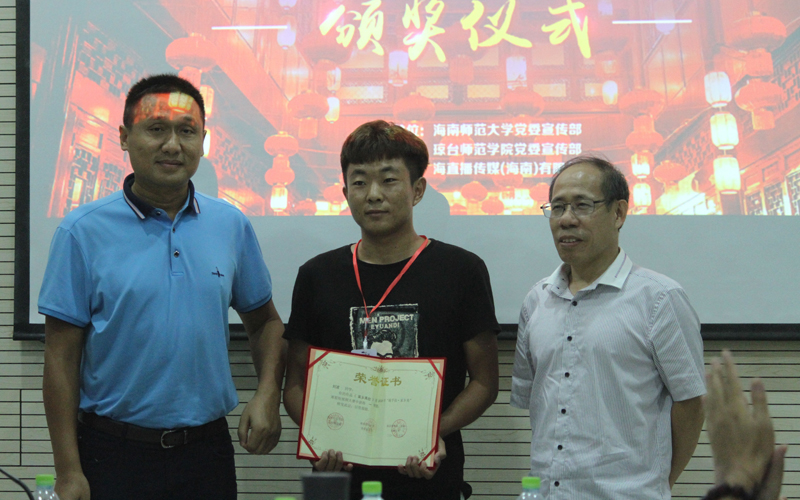 颁奖仪式上,海直播传媒(海南)有限公司丁黎平总裁、海南师范大学宣传统战部王增智副部长、我校宣传统战部郭志东部长分别讲话。郭部长对我校参赛的学生提出了几点要求:要学以致用,把自己的学习与艺术实践融汇到时代的洪流中,成为建设海南自由贸易港的有用人才。