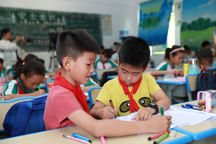 在另一间教室,海南省小学美术学科带头人魏秀丽带领三年级的同学们一起遨游在美妙的色彩世界,魏老师选择了与传统课程导入不同的方式,把课堂自主权交给学生,让学生充分发挥自己的想象力,在后续的实践绘画中,同学们相互合作,发挥自己的想象,在课前先发下来的图纸上,给主体上色,同学们绘出了不同的颜色,开发了他们的发散性思维。课堂上,孩子们积极参与,还有“同学提问同学答”的模式,让孩子们受到很大启发。
